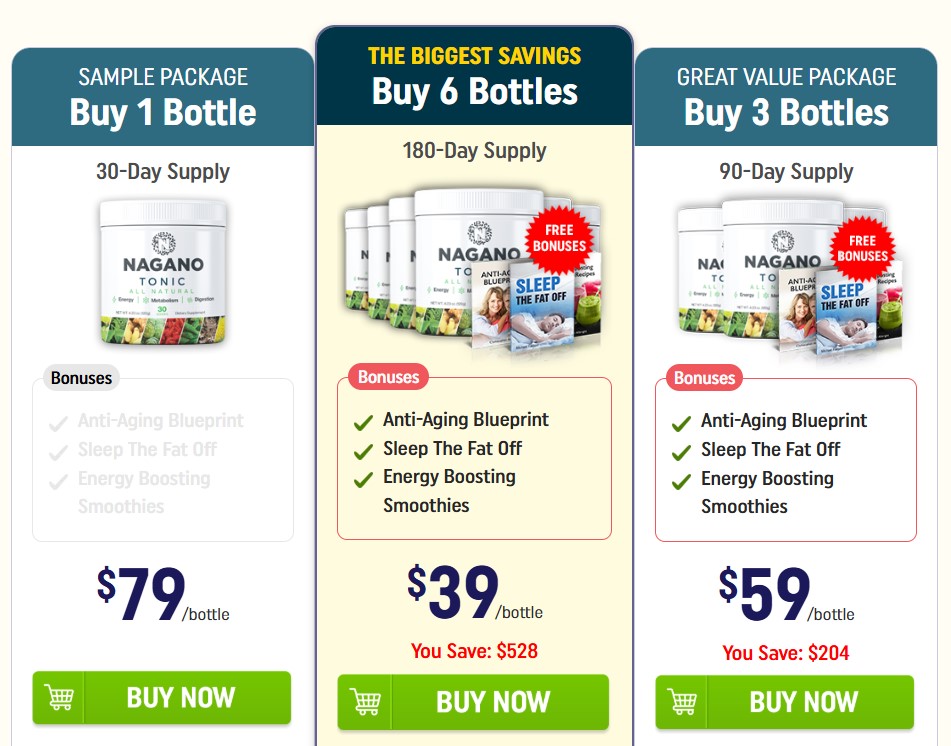 The pricing of Nagano Tonic may vary based on offers and packages available at different times. For the latest and most accurate pricing, users should check the official website.